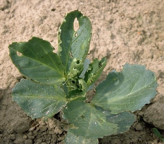 Text: Besonders entlang von Hecken picken Spatzen, Finken oder Lerchen an jungen Rüben und knipsen die Keimblätter ab. Da der Vegetationskegel in der Regel unbehelligt bleibt, können die Rüben weiterweiterwachsen