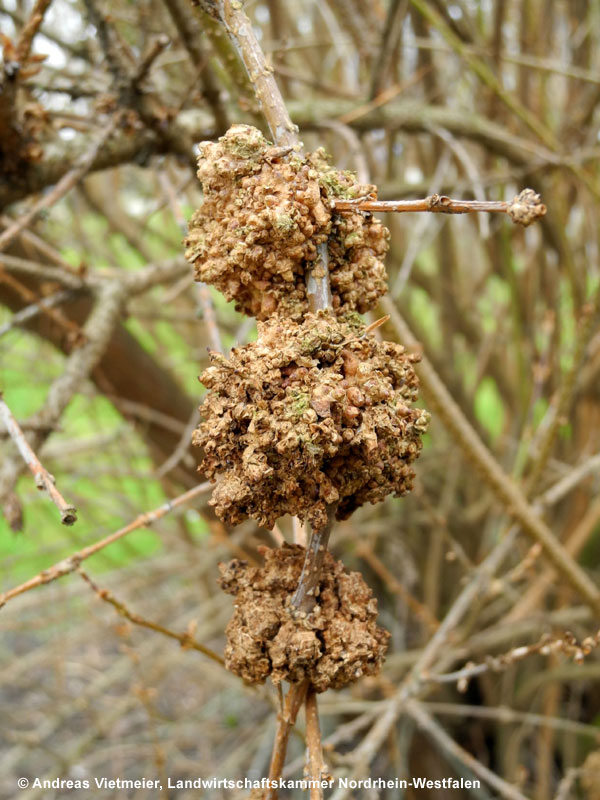 Text: Stark befallene Pflanzen bzw. Triebe stehen wie Leuchttürme über dem Bestand