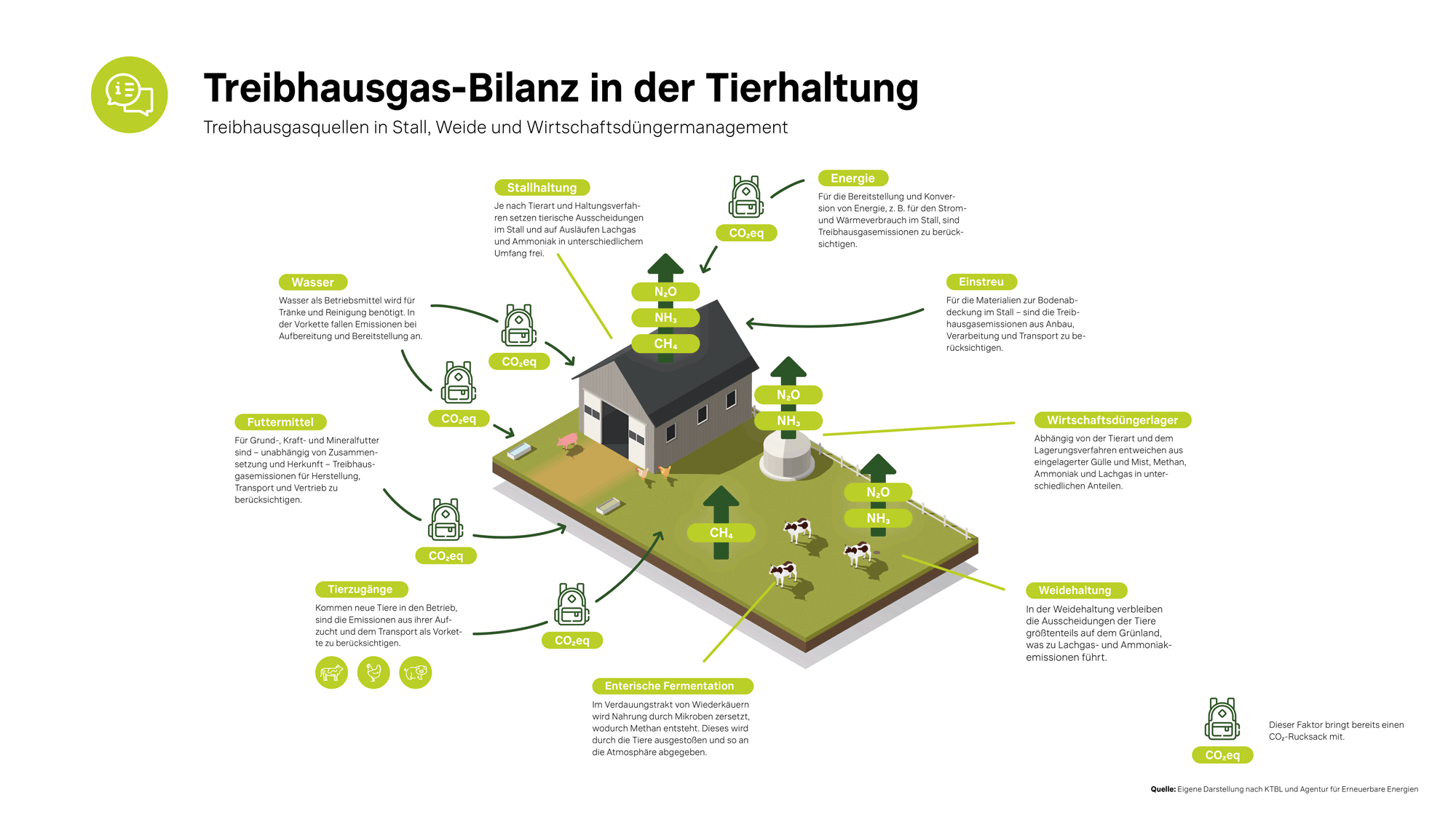 In der Tierhaltung entstehen Emissionen hauptsächlich durch Methan und Lachgas. Methan wird bei der Verdauung von Wiederkäuern und bei der Lagerung von Wirtschaftsdüngern freigesetzt. Lachgas entsteht bei der Ausbringung und Umsetzung stickstoffhaltiger Dünger.