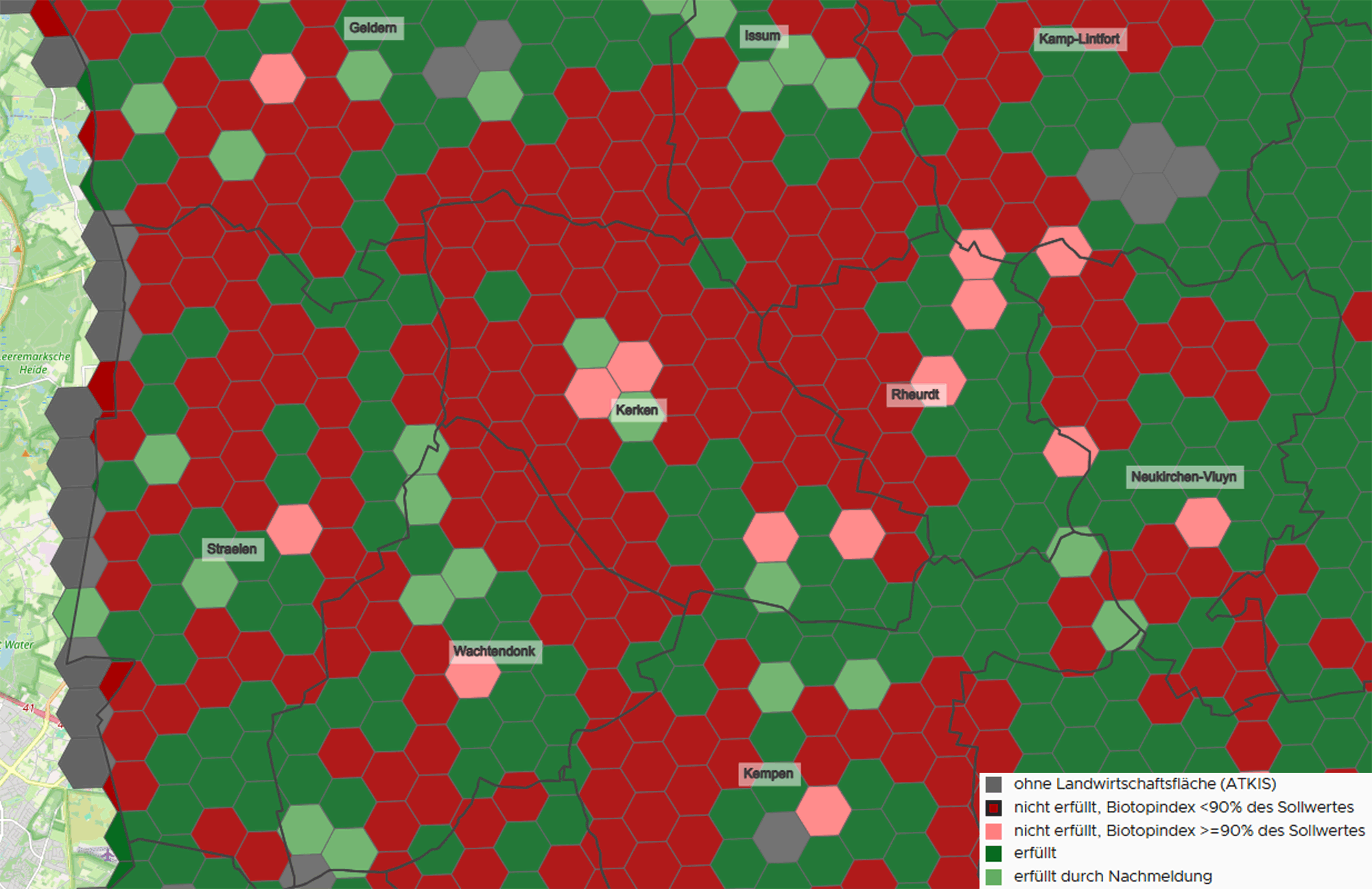 Gemeinden, die in mindestens 50 % ihrer Gemeinde-Hexagone (s. Abbildung 5) den Sollwert von 10 % Kleinstrukturen aufweisen, erhalten den Status erfüllt. Gemeinden, die diesen Status nur knapp erfüllen oder verfehlen, sind potentiell von einer jährlichen Veränderung betroffen.