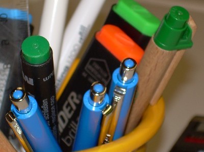 - Stifte, Kugelschreiber und Textmarker, die nicht mehr schreiben: In den Müll oder nachfüllen.