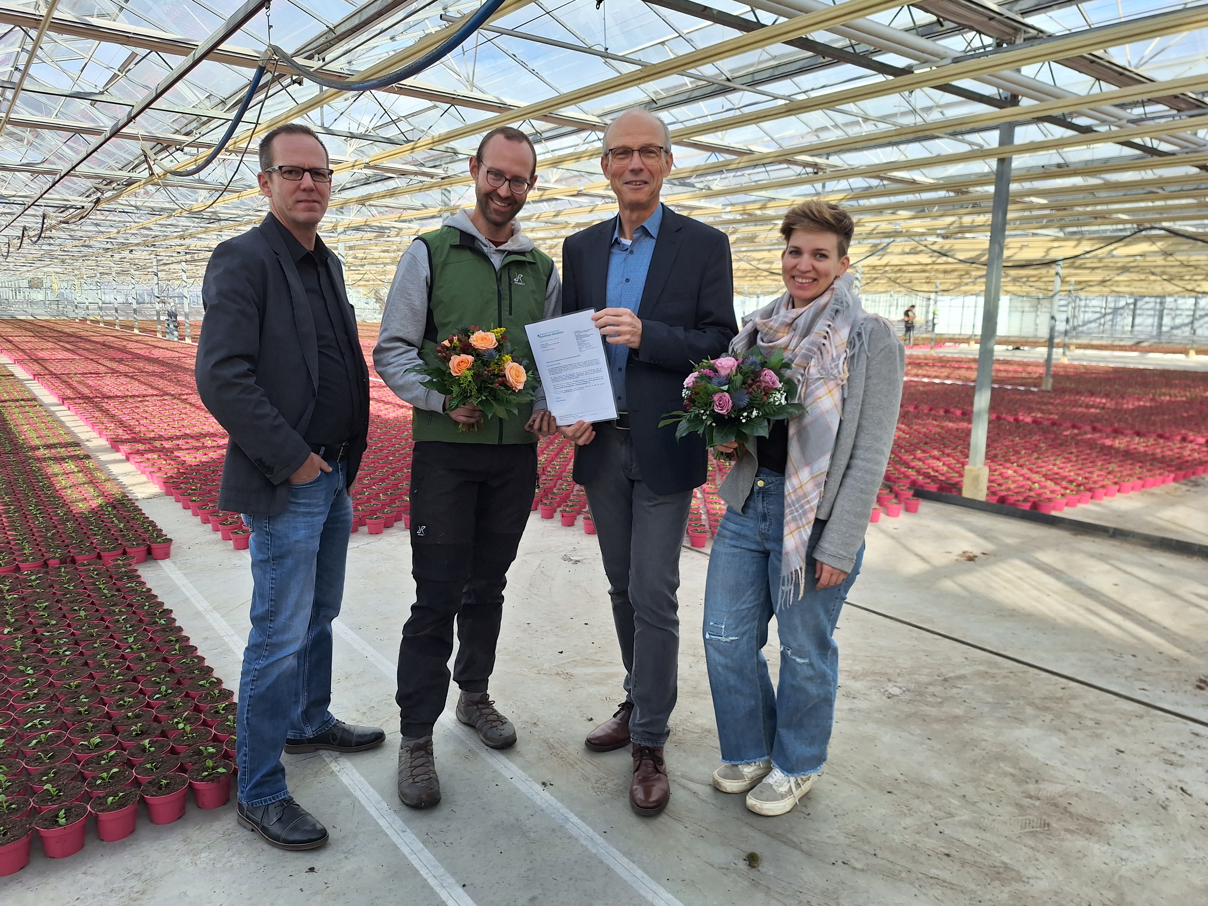 Dominik Unkel (2. v. l.) aus Sevelen am Niederrhein erhält den diesjährigen Zukunftspreis der Landwirtschaftskammer NRW. Andrew Gallik, Leiter des Versuchszentrums Gartenbau Straelen / Köln-Auweiler (3. v. l.) und Marcus Trappe, Agrobusiness Niederrhein (l.) überbrachten ihm die Botschaft an seinem Arbeitsplatz, dem Gartenbaubetrieb Janshen, rechts im Bild Vera Janshen-Budzinski.