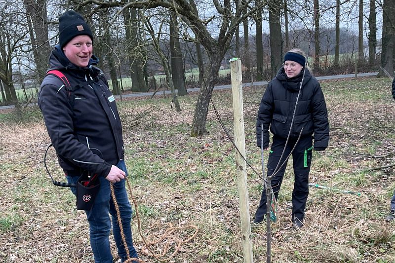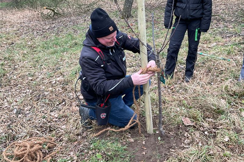 Neben dem Baum wurde ein stabiler Stützpfahl gesetzt, an dem der junge Baum mit geeignetem Bindematerial befestigt wurde. Diese Maßnahme dient der Stabilisierung in der Anwuchsphase.